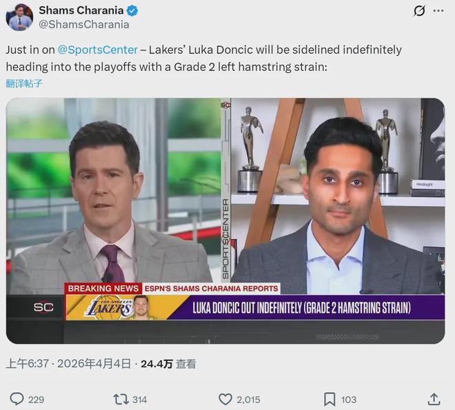 北京时间4月4日上午6点半,据NBA名记Shams与Dave McMenamin联合报道,湖人球星东契奇被诊断为左腿筋二级拉伤,不仅常规赛报销,季后赛也是无限期缺阵。腿筋二级拉伤在NBA的平均缺席时间为35天,大约15场比赛。
