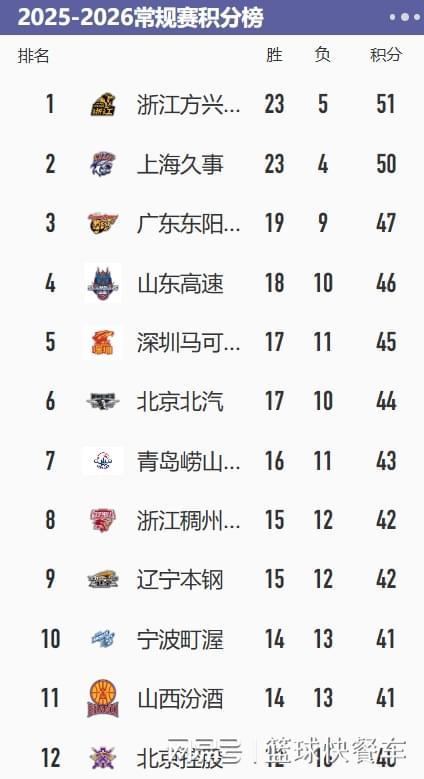 附:CBA积分榜最新排名