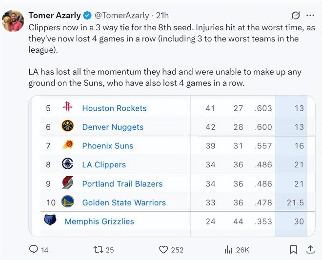 快船记者Tomer Azarly称,快船目前的战绩跟开拓者、勇士很接近,但伤病找上了他们,目前他们正值一波四连败还连续输给联盟最弱的球队。快船已经失去了之前所拥有的全部优势,并且已经无法跟太阳去竞争西部第七,就算太阳也是四连败可跟快船的胜场差也有5个之多。