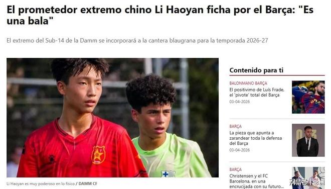 据《每日体育报》报道,14岁中国小将李昊炎将在下赛季加盟巴萨U15梯队。李昊炎司职边锋,目前效力达姆U14梯队。本赛季打入8粒进球,速度极快,冲击力超强。